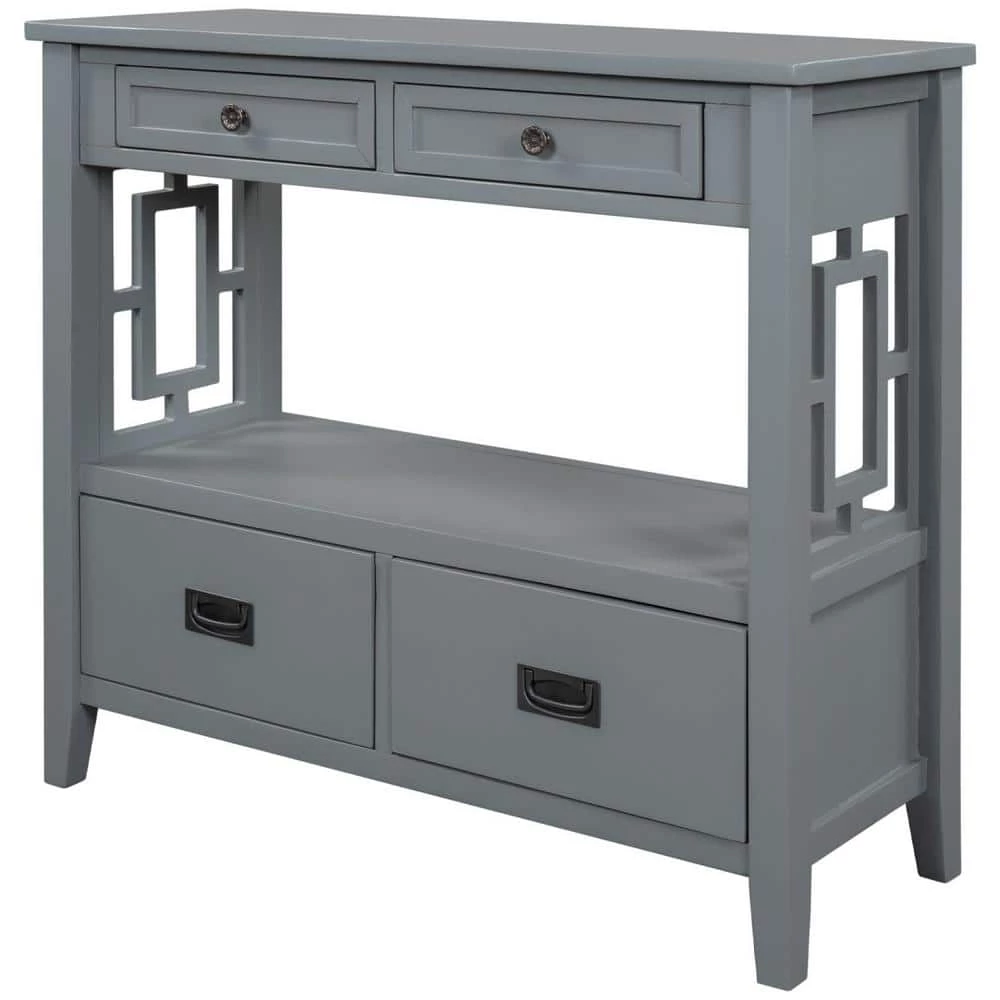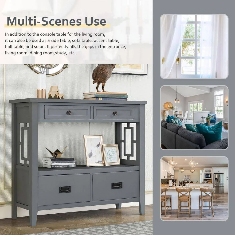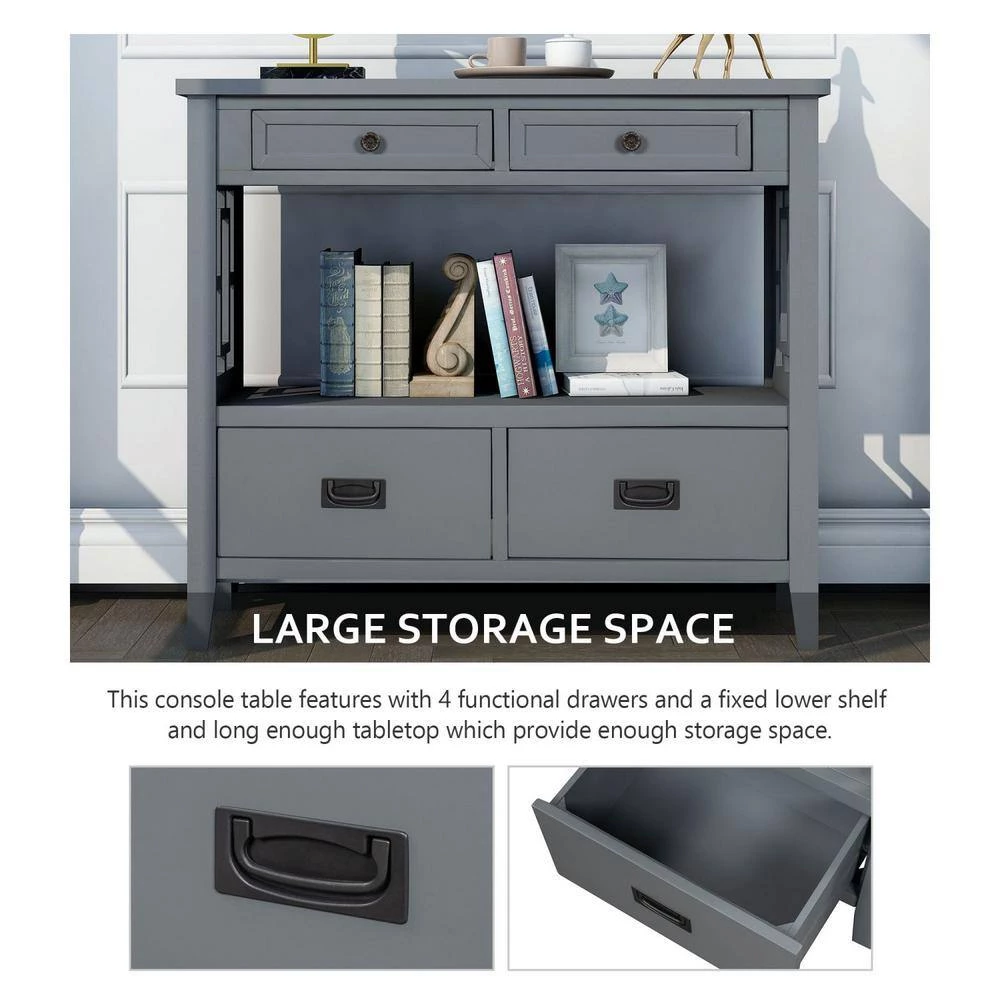 If you want to bring the retro atmosphere to your living area, this classic simple-style console table is the best choice! The multifunctional design is to meet your variety of needs. Crafted with solid pine wood and high-quality MDF, it comes complete with two top drawers and bottom drawers that open to hold your daily necessities and keep them away from your eyes. And the spacious shelf is a wonderful place for storage baskets, sundries, books, and daily necessities. There are two kinds of handles for drawers, the vintage carved round Antimon handles for the top drawers and the simple and modern hidden Antimon handles for the bottom drawers. This table is suitable for the living room, bedroom, stairs area, and next to the sofa. Your guests will talk about it actively afterward.