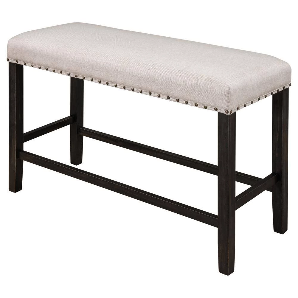 Comes with a table, chairs, benches**, this graceful counter height dining set is designed for small places. All of the chairs and bench can be stacked under table when not in use to save space. Featuring with rustic espresso coating and beige cushions as well as bronze decorated nails, this kitchen set will bring a bold but soft presence to any dining room. To offer extra room for small rooms, the bench can not only be as a dining bench but also be a shoe bench in your entryway which is multifunctional for your home with its upholstered seating.** Please check which products the dining table set contains!