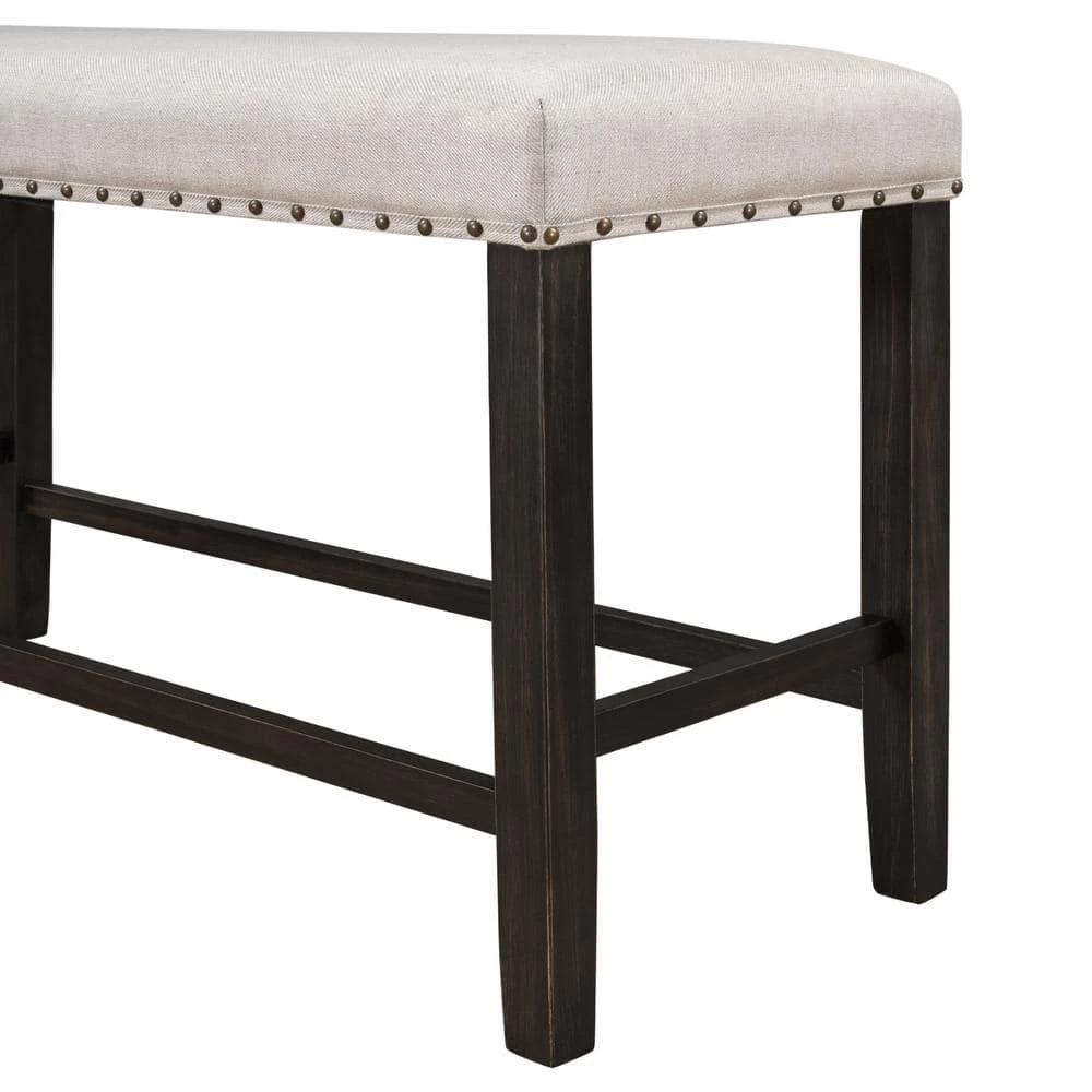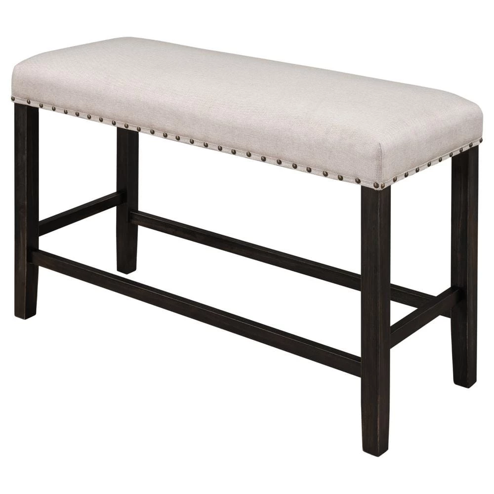 Comes with a table, chairs, benches, this graceful counter height dining set is designed for small places. All of the chairs and bench can be stacked under table when not in use to save space. Featuring with rustic espresso coating and beige cushions as well as bronze decorated nails, this kitchen set will bring a bold but soft presence to any dining room. To offer extra room for small rooms, the bench can not only be as a dining bench but also be a shoe bench in your entryway which is multifunctional for your home with its upholstered seating. Please check which products the dining table set contains.