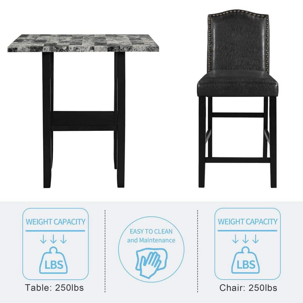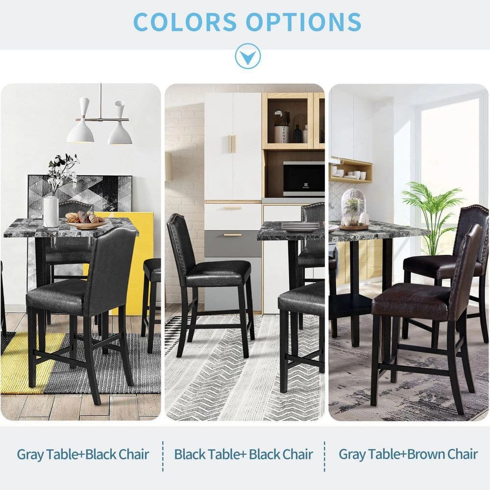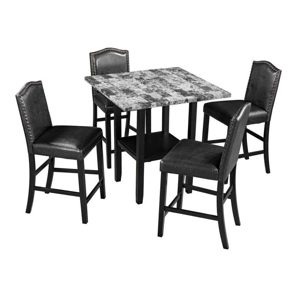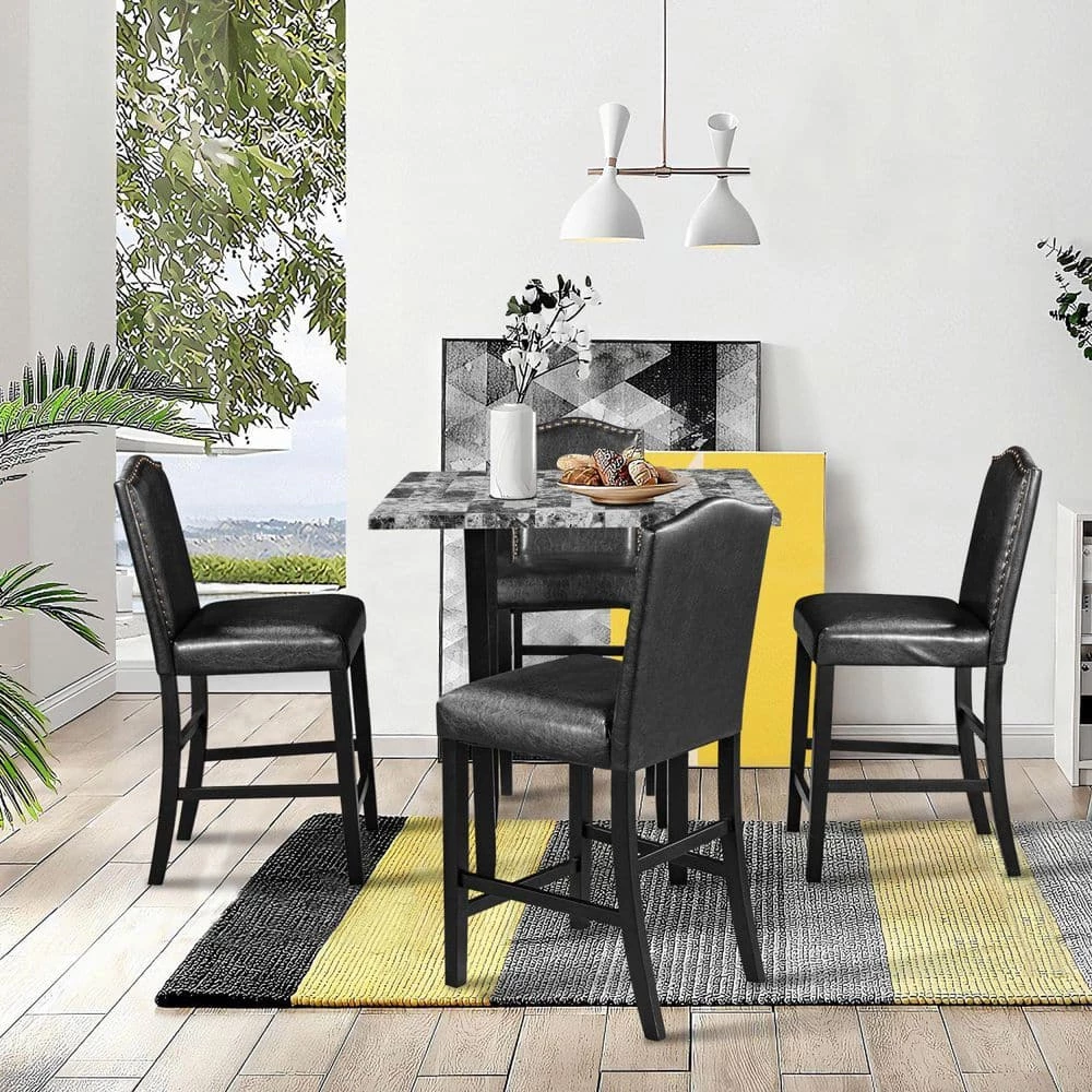 Transform your dining room, kitchen area and more into a multi-functional space with this 5-piece dining set. The wooden frame pairs perfectly with the exquisitely crafted tabletop featuring a marble pattern veneer to create a modern look, while the matching chairs are decorated with nail head trim for added charm. This dining table set will last you and your family for years to come.