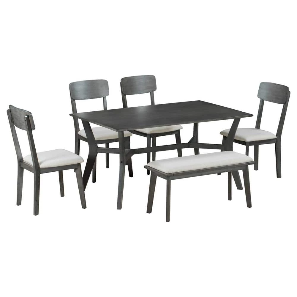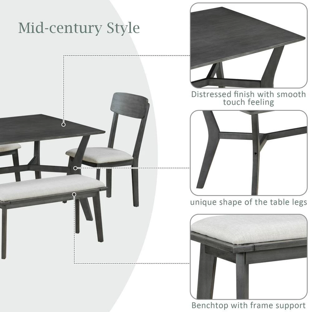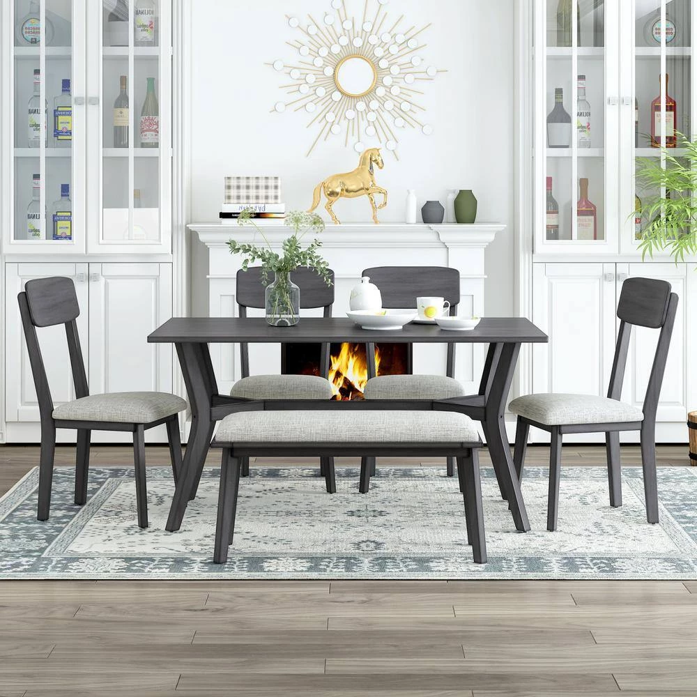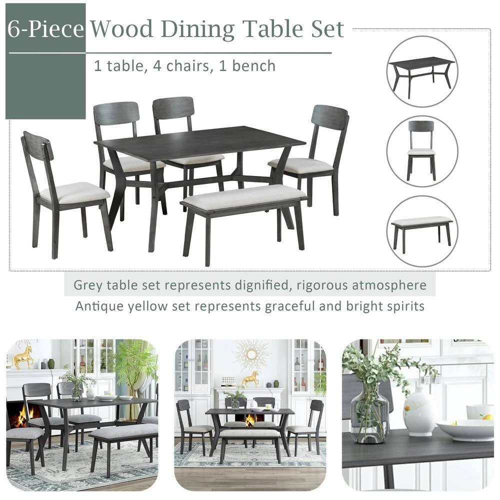 This set contains a table, four chairs and a bench. Unique shape paired with wood finish, perfect for retro style crowd, perfect for home use. The all grey table set represents dignified, rigorous atmosphere, while the other color antique yellow brings graceful and bright spirits to your house.