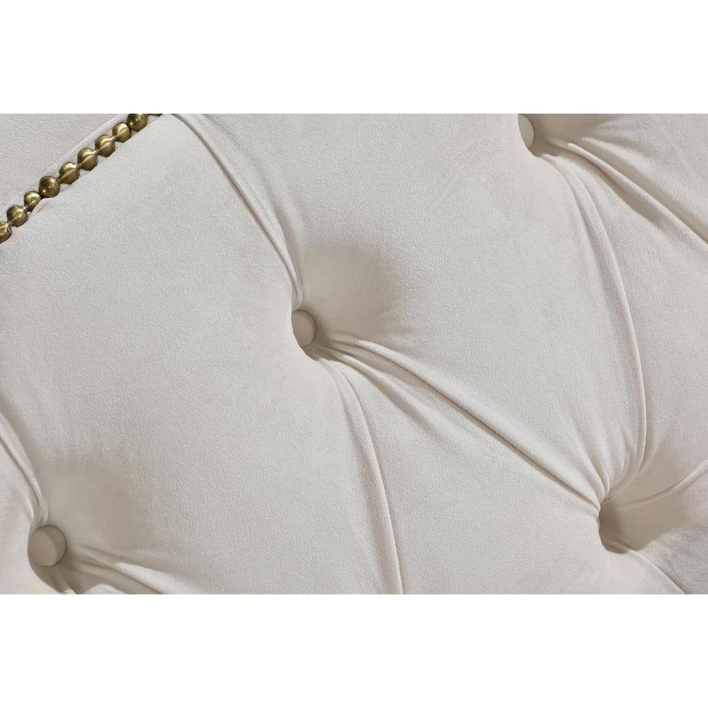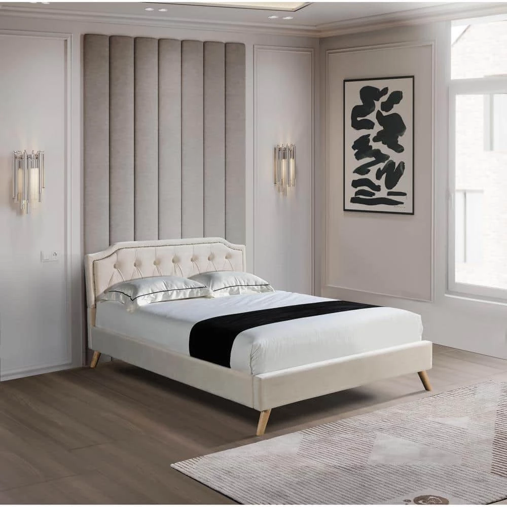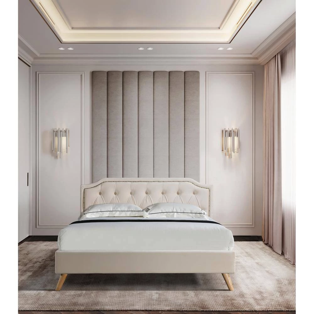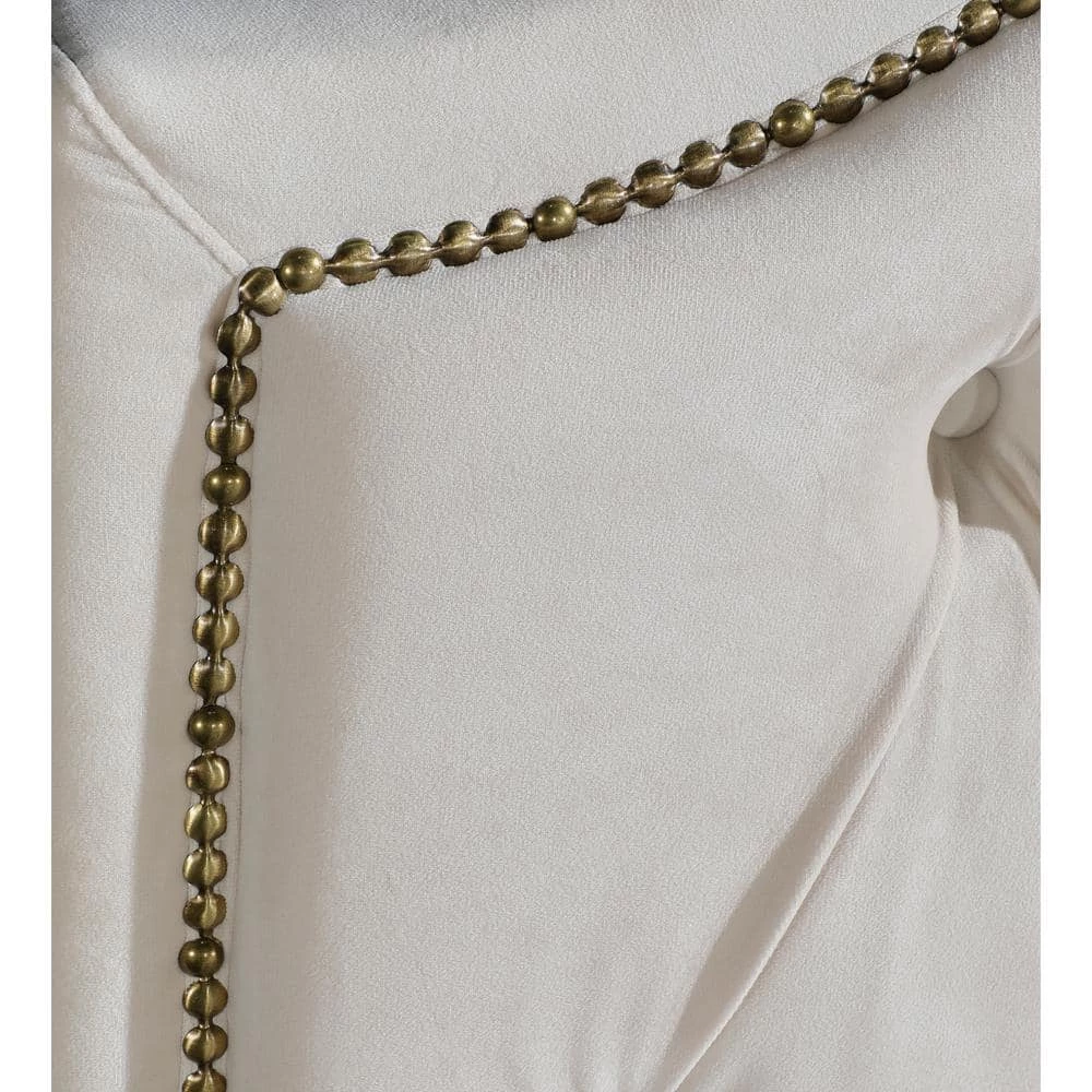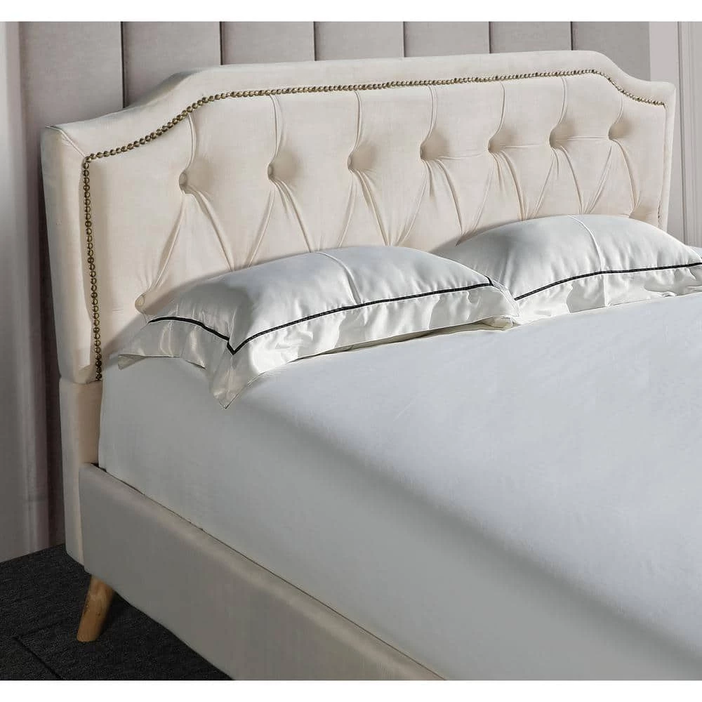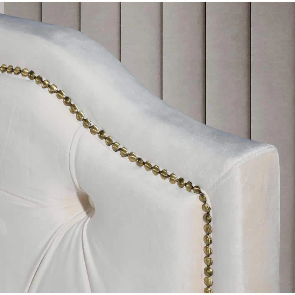This bed frame has a curved style headboard with brass nailhead trim, featuring a classic design with contemporary aesthetics. A hint of glamour is all you need to take your space from simple to stunning. This will last you and your family for years to come!