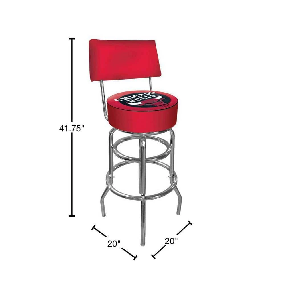 Add a splash of team spirit to your home with the Trademark NBA-Chicago Bulls Bar Stool. This bar stool is designed with a low back, easily sliding completely under the counter. It features a swivel mechanism, which makes it easy to get in and out without needing to squeeze your way in between the bar and the stool. It features a modern style, offering a trendy touch to your current interior design. This stool is designed with a metal frame, so it can tolerate frequent use. It has a vinyl seat, which resembles leather but is particularly easy to maintain. This stool has a red cushion, incorporating a fun and vibrant atmosphere into the room. It has a Chicago Bulls logo, which makes it great for basketball fans. It features a foot rest, ensuring a more ergonomic design and promoting better alignment.