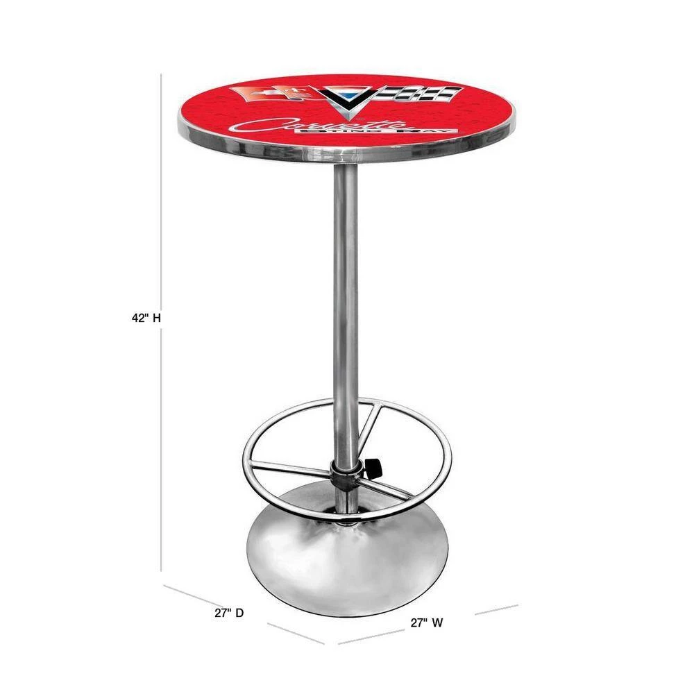 Impress your guests with your officially licensed chrome pub table. This fully functional pub table will be a stylish accent to your game room, garage or collection. The table top features an authentic logo trimmed with chrome finished plastic banding and is supported by a chrome base. The chrome base is both lightweight and durable. It features an adjustable foot rest for customizable comfort. Bring style, function and comfort to your game room, garage or collection with an officially licensed chrome pub table.
