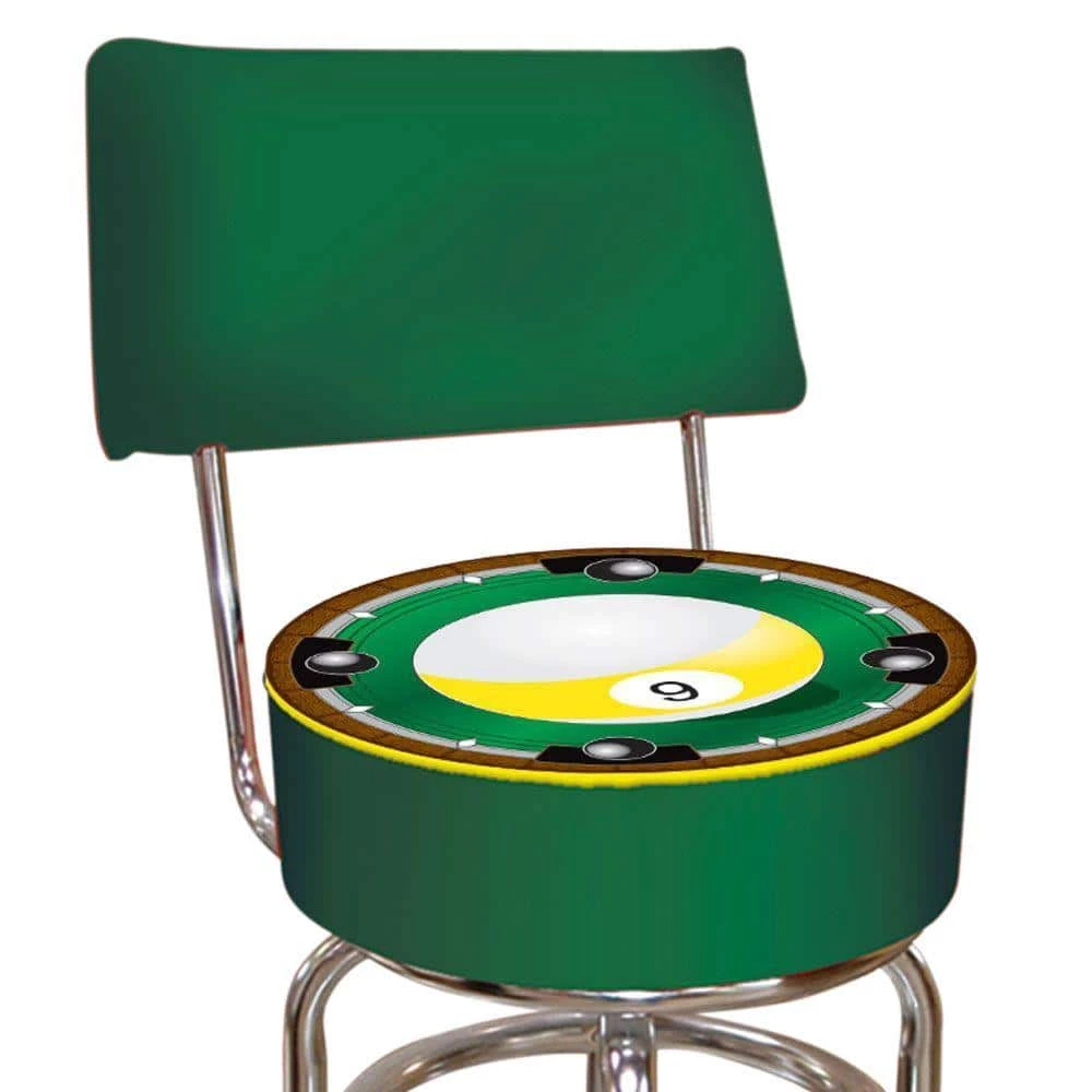 Upgrade your seating area with the Trademark Nine Ball Bar Stool. This bar stool features a vinyl seat, which resembles the look of leather but is particularly easy to maintain. It features a metal frame, so it can stand up to frequent use. It has a swivel mechanism, so you can easily interact with other people in the room without moving your chair. Designed with a low back, this bar stool has a more minimalist style that still provides some support. It has a modern style for a fresh design. This bar stool features a foot rest for enhanced comfort and support. It has a green cushion, bringing a cheerful and vibrant vibe into any room.