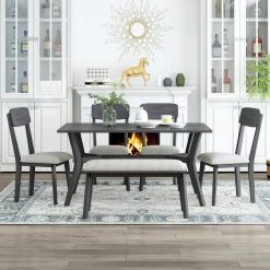 6-Piece Dining Table Set Mid-Century Style Wooden Dining Table and Chair with Bench by JASMODER