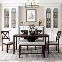 6-Piece Kitchen Simple Wooden Dining Table and Chair with Bench, PU Cushion by JASMODER