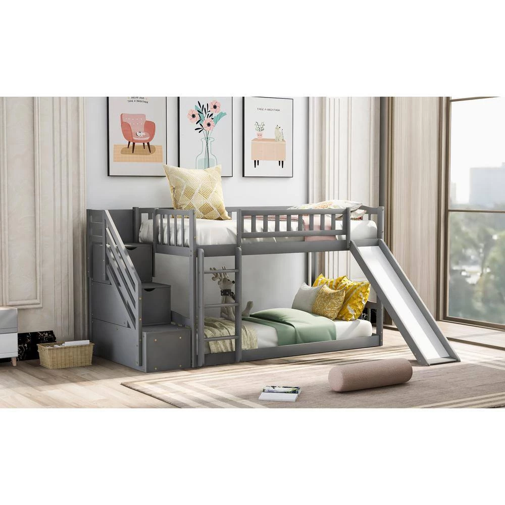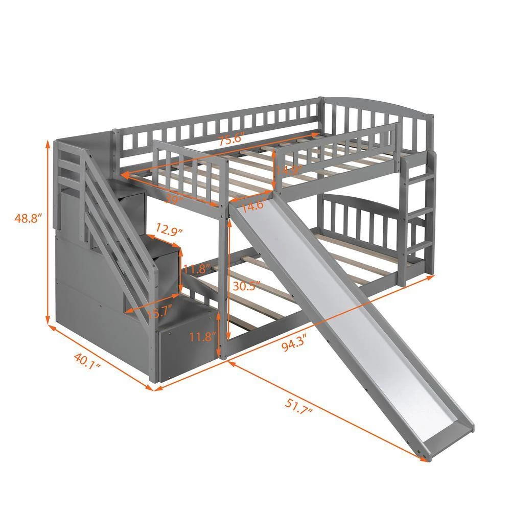 - With a built-in ladder and staircase, it is easy for you to climb up and down from top bed. Featuring a low slide for you to play, bunk bed can add fun to you and develop your sense of balance and coordination. slide and ladder are convertible, both of them can be put left or right. What’s more, staircase with drawers can be put left or right.