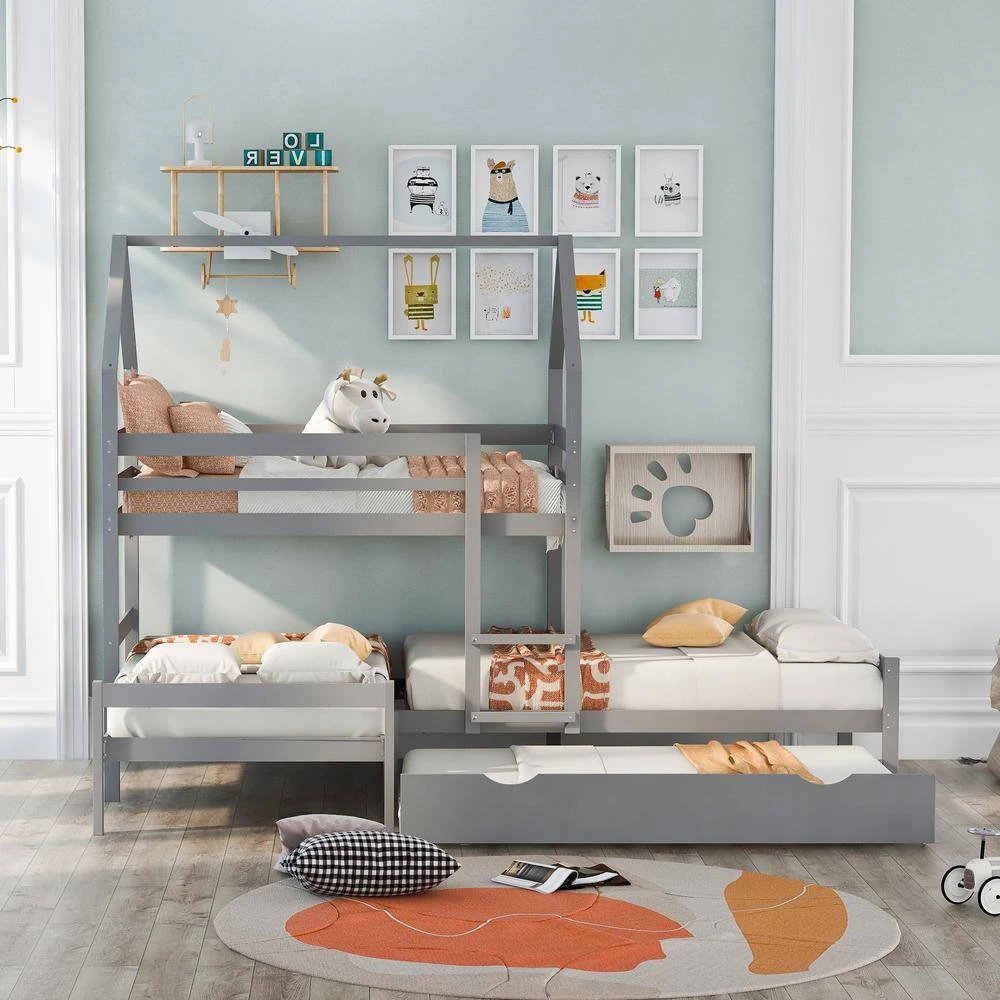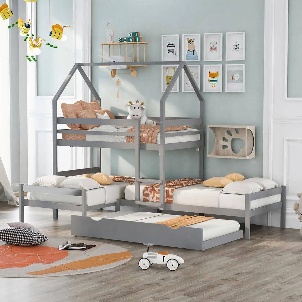 This is a versatile, mission-style Twin over Twin over Twin Triple Bed Bunk bed with Trundle. Save space while giving your bedroom an extra bonus of fun with this bed. Finished in a trendy and clean color, it’s sure to fit any room in your home. Combined with four twin beds, the l-shaped bunk bed is perfect for a family with 3 to 4 people, sleepovers, or your extra guest to enjoy the sleeping time. High-quality, solid pine wood, and MDF materials ensure stability and durability for long-term use. Full-length guardrails and integrated ladder are equipped to keep you safe. It suits all styles of home decoration and completes the look of any bedroom.