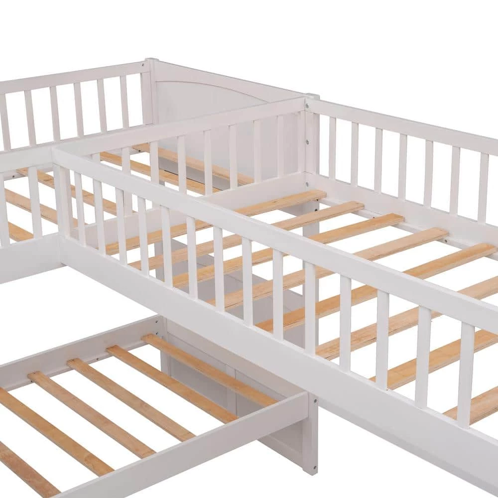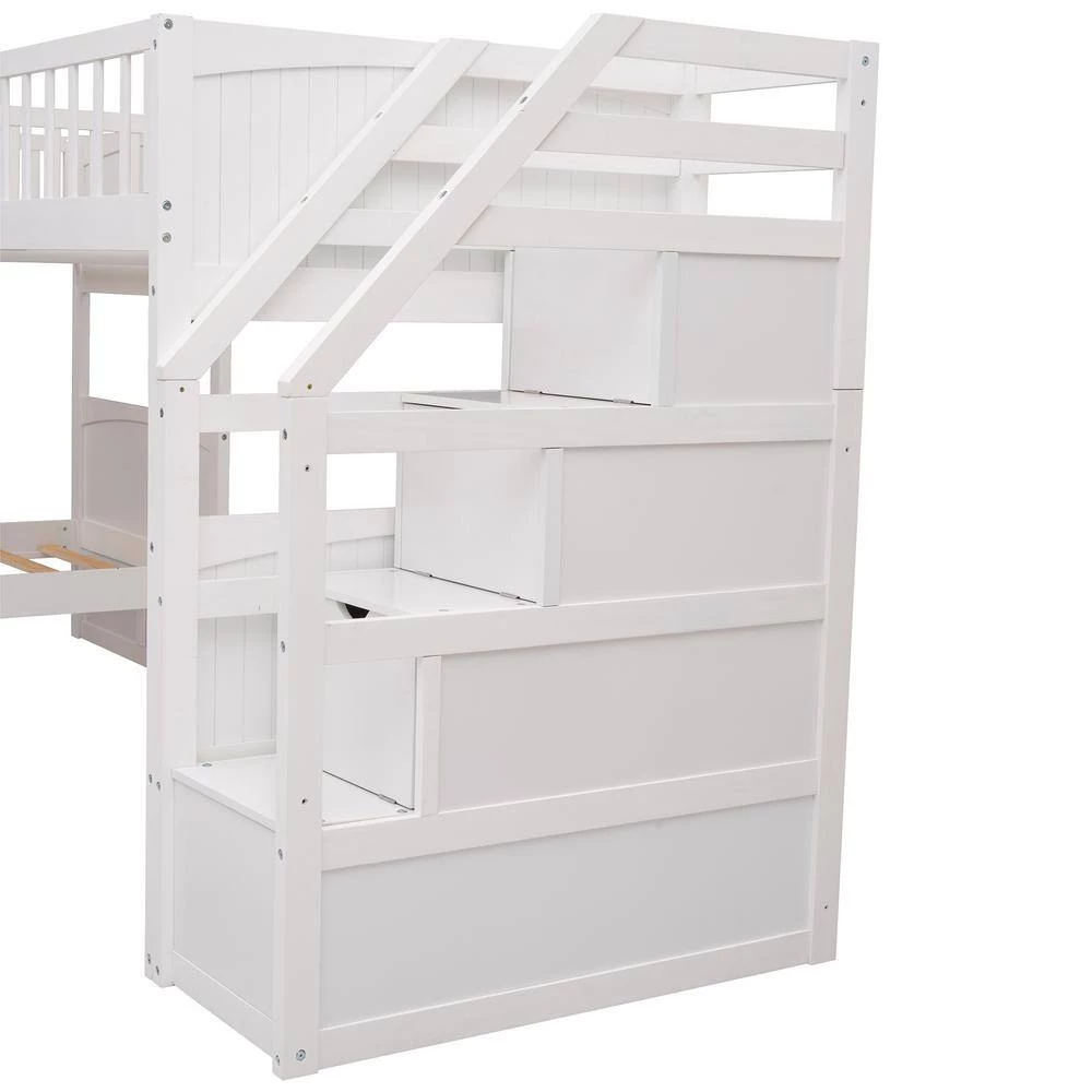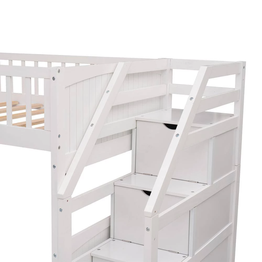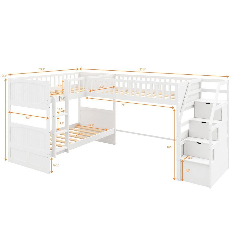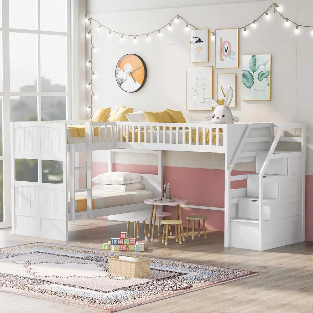 - L-shaped bunk bed features 3 beds, a traditional height twin over twin bunk bed, a loft bed, and an attached stairway with storage, it could be used for overnight friends, perfect for limited space. space under loft could be used as a play area, or you can also put your dressers or desk to make best use of your space.